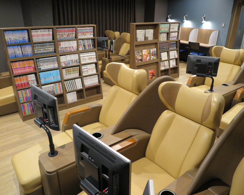 こちらの最大の魅力は、休憩スペースにぎっしりと用意された漫画ライブラリー。宿泊者はもちろん、短時間の休憩利用でも漫画読み放題となるため、サウナで「ととのった」後に、名作や話題作を心ゆくまで楽しむ至福のひとときを過ごせます。